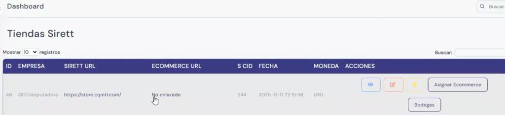 Una vez agregadas las credenciales se deben enlazar con un sirett. Podemos buscar las credenciales que creamos buscando en Tiendas y filtrando por “id”